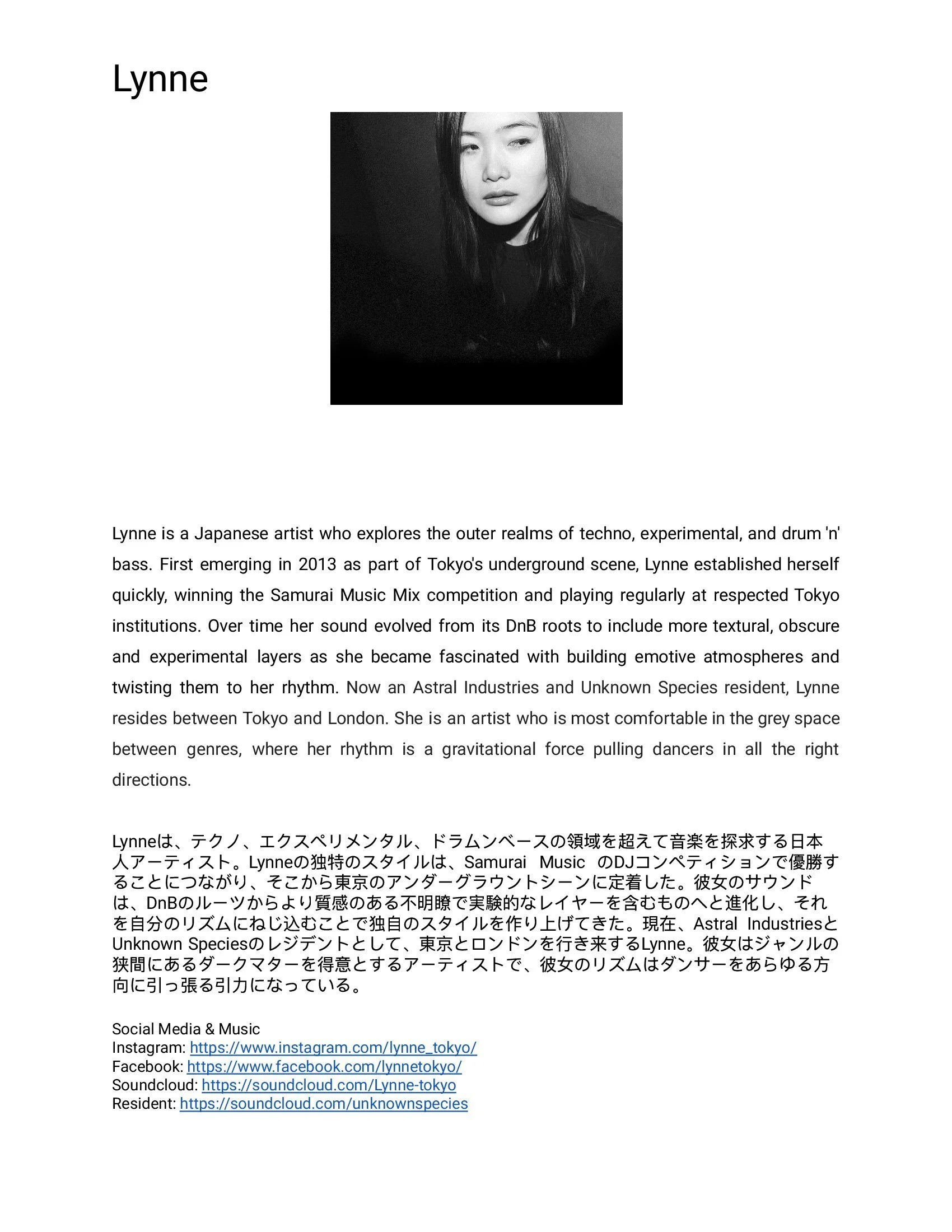 Lynne’s final press kit included a selection of artist photographs, long and short bios in PDF, as well as Japanese translations for events within Japan.