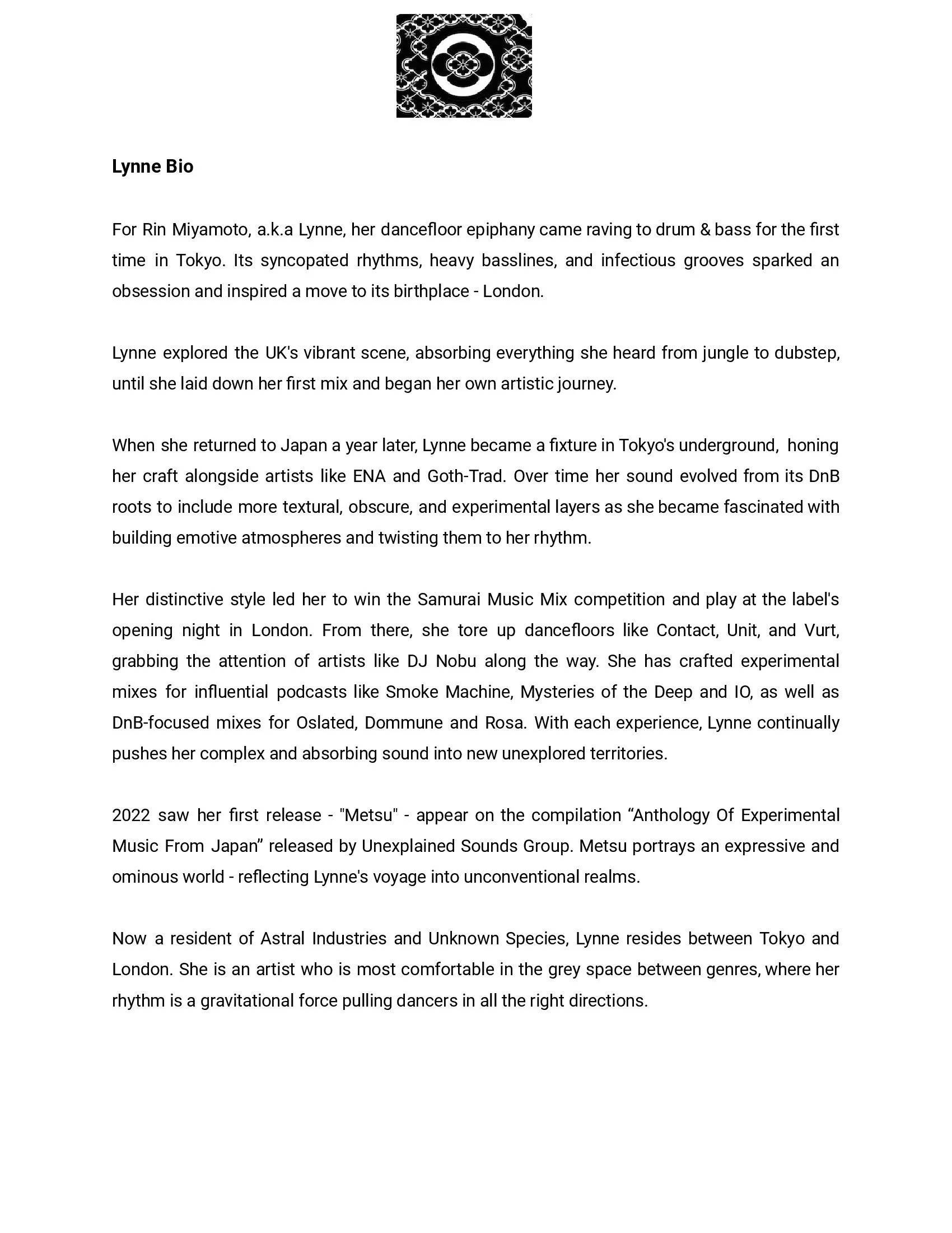 Initially, Lynne approached me to update her artist bio for Resident Advisor. As the creative process developed, we decided to create a full press kit, working on long and short bios to send to future events, festivals, and labels.